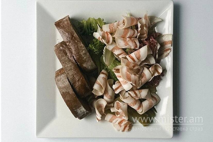 Закуска з маринованим в спеціях бочком, соленим огірком, цибулею марс та підсмаженою житньою чіабатою.