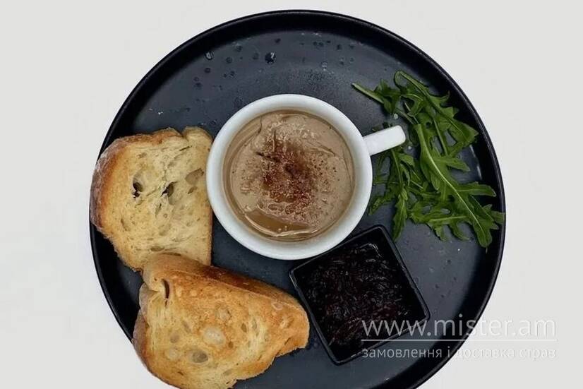 Ніжний мус з курячої печінки, подаємо з цибулевим мармеладом та хрусткою пшеничною чіабатою.
