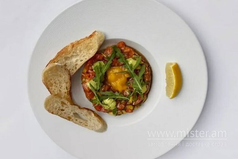 Шматочки свіжого лосося в соєвому соусі та спеціях доповнюємо авокадо, каперсами, зеленою цибулею. Подаємо на подушці з мусу вʼялених томатів зі шматочками манго, майонезом з зеленої цибулі та грінками французького багету.