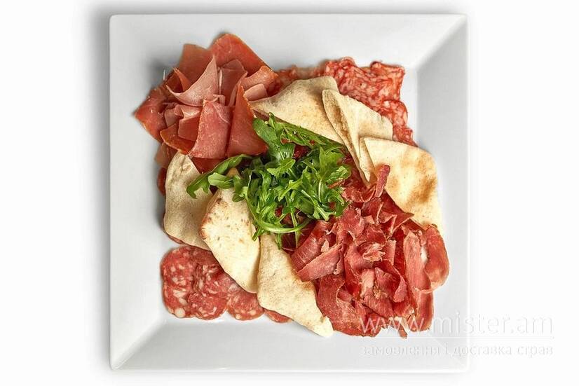 Два види італійської салямі, пармська шинка, в’ялена яловичина. Доповнені хлібними подушечками фокачо, в’яленими томатами та хрусткою руколою.