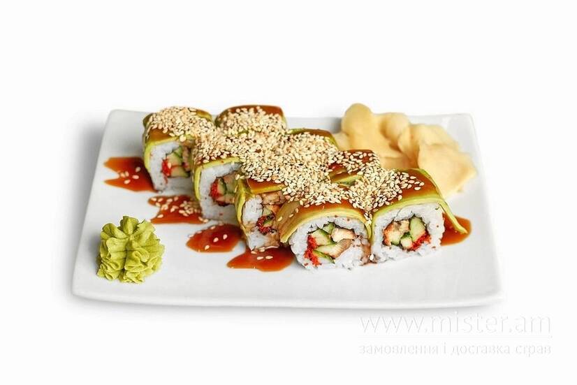 Вугор, огірок, ікра масаго, покриваємо авокадо, поливаємо соусом унагі та посипаємо білим кунжутом.