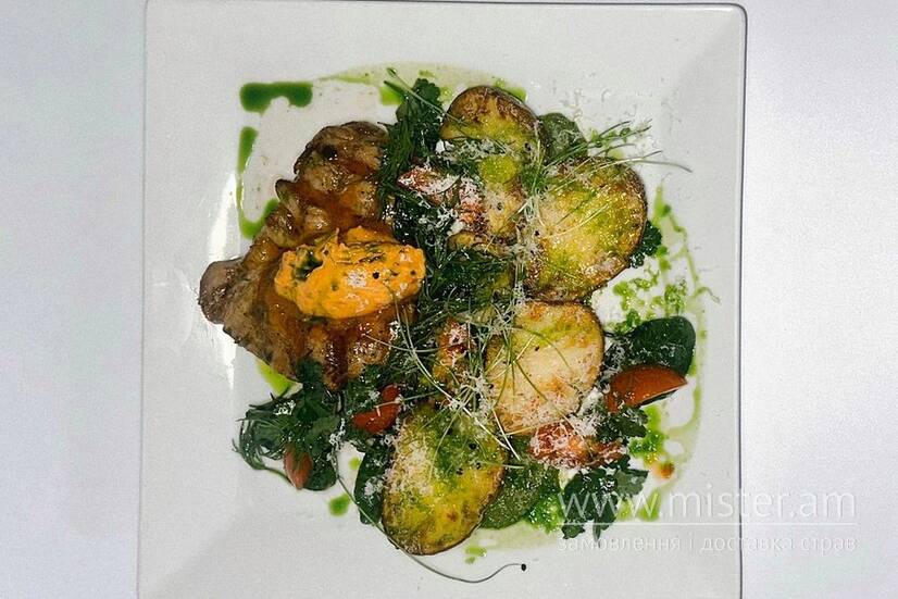 Show Basilic Стейк "Базилік" з соусом чимічурі, пармезановою картоплею та зеленню