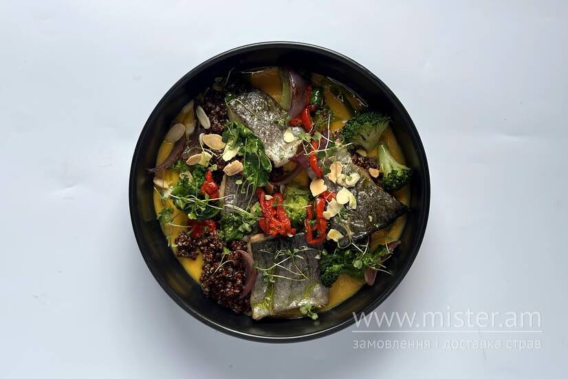 Ніжне філе форелі, мариноване в солі, перці та оливковій олії, обсмажене до легкої скоринки. Подається з гарбузовим кремом, кіноа, печеним болгарським перцем, синьою цибулею, броколі, шпинатом та томатами кімчі.