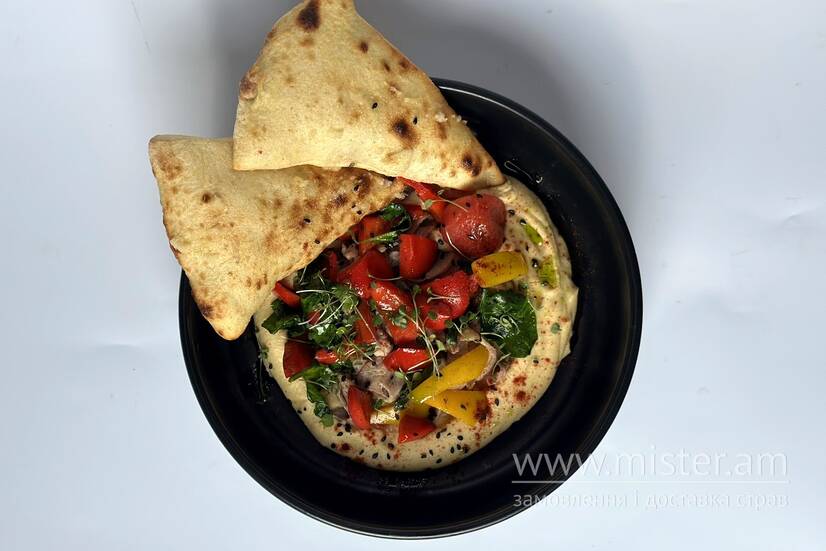 Ніжний класичний хумус з індичкою су від. Доповнюємо обсмаженим шпинатом та болгарським перцем. Подаємо з часниковою фокачою та томатами кімчі.