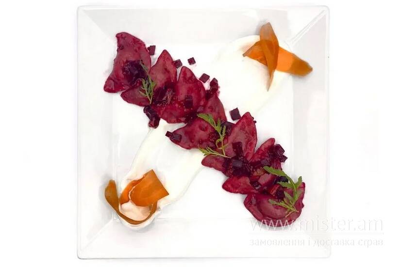 Show Basilic Бурякові вареники з білими грибами та картоплею в соусі Мостарда