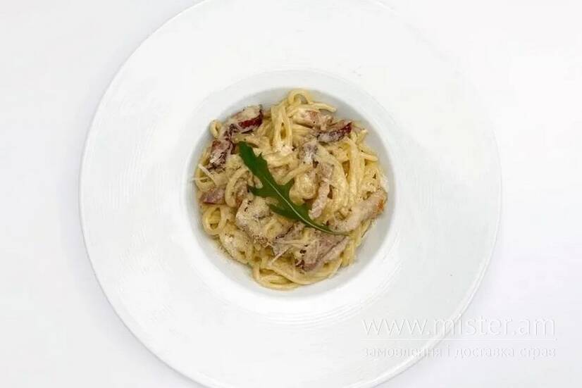 Домашня ситна паста зі смаженим беконом на основі вершкового соусу, жовтка, пармезану та мускатного горіха.