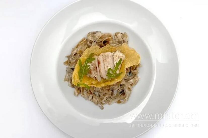 Ситна житня паста в поєднанні з міксом лісових грибів, вершків та соковите індиче філе подаємо в хрусткому чипсі з кукурудзи.