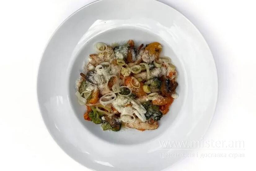 Ситна паста власного виробництва в ніжному томатно-вершковому соусі, з курячим філе, броколі, печерицями та соковитими томатами чері. Доповнена цибулею порей, пармезаном та свіжою зеленню для неперевершеного смаку!