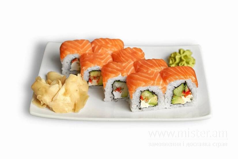 Крем-сир, авокадо, огірок, зверху ікра масаго.