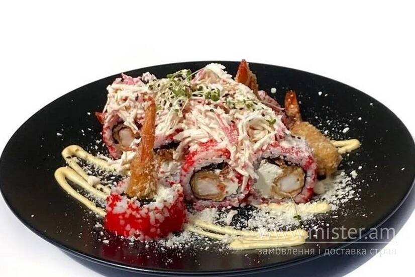 Креветку в темпурі, крем сир та цибулю кранч, подаємо з ікрою масаго. Зверху сурімі з соусом айолі та пармезан.