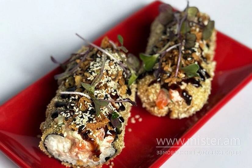 Хрусткий рол в золотій скоринці темпури, зі шматочками лосося у соусі айолі, з крем-сиром, свіжим огірком, кранч цибулею та унагі соусом.