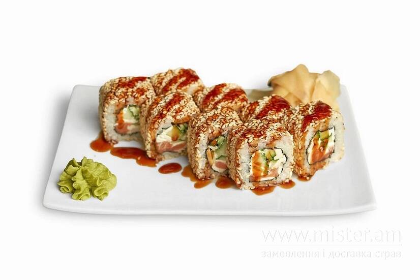 Копчений лосось, смажена курка, огірок та крем-сир всередині. Зверху білий кунжут та соус унагі.