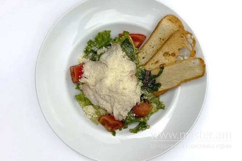 Класичний та популярний салат з печеним філе курча, листям салату, крутонами та томатами, в поєднанні з соусом цезар. При подачі посипаємо пармезаном.