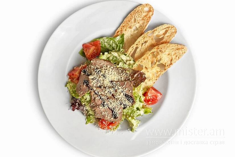 Салат Цезар з ніжним яловичим філе, хрустким листям салату, крутонами, томатами конкасе, у поєднанні з соусом цезар та пармезаном.