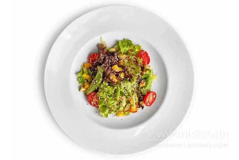 Ніжний салат з мусом вугря та крем сиру, доповнений солодким манго та соусом унагі з авокадо, томатами чері та кунжутом.