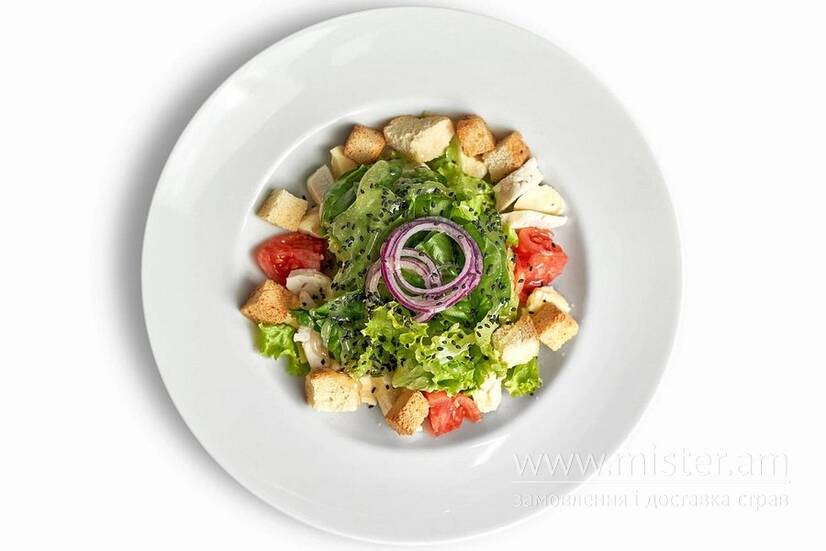 Салат з ніжною куркою су-від та сиром моцарелла в поєднанні з міксом листя салату, томатами конкасе, цибулею марс та сухарями. Подаємо з медово-оливковим соусом та кунжутом.