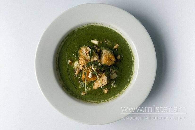 Ніжний та легкий крем-суп зі шпинату, з додаванням курячого бульйону та вершків. Доповнений грінками пшеничної чіабати, грецьким горіхом, оливковою олією та сиром горгонзола.