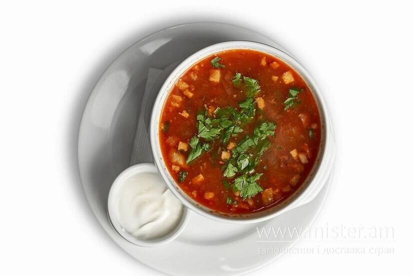 Ситний суп, в основу якого входить: копчений бочок та шинка, яловичина су-від та яловичий язик. Поєднуємо з томатами, солоним огірком, маслинами та цибулею. Подаємо зі сметаною та зеленню.