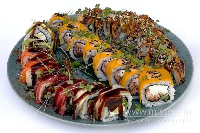 Сирний рол із запеченим лососем, філадельфія з обсмаженим лососем, рол Рейнбоф.