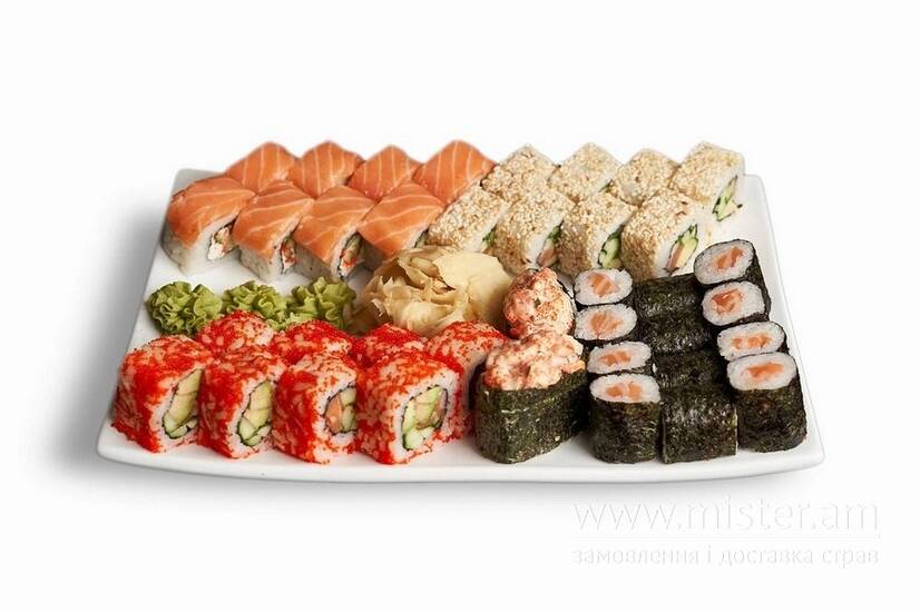 Філадельфія копчений лосось, Каліфорнія кунжут копчений лосось, Каліфорнія масаго копчений лосось, макі копчений лосось 2шт., спайсі з копченим лососем 2 шт.