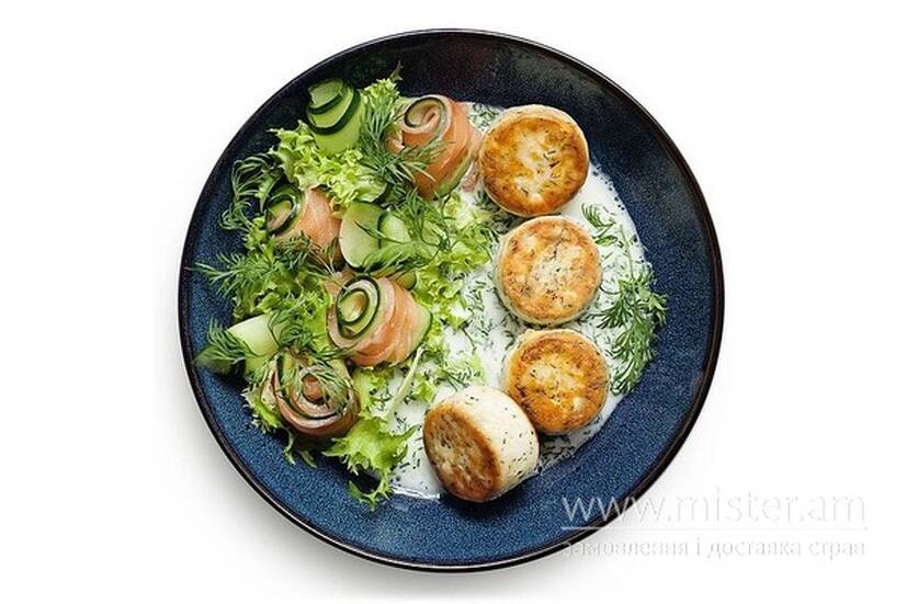 Сніданок, який поєднує у собі смак смажених солених сирників зі слабосоленим лососем, міксом салату, огірком з традиційним кисломолочним "айраном" та зеленню.