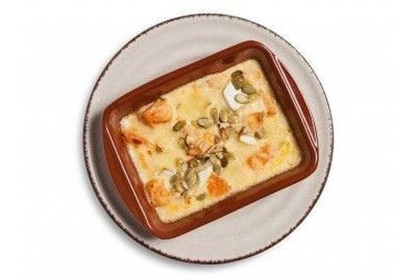 Запечений гарбуз з сиром Брі, під вершковим соусом, доповнений легкими нотками часнику та насінням гарбуза.