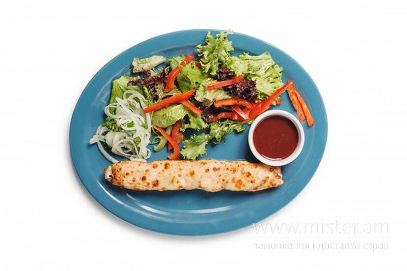 Люля-кебаб з ніжним м'ясом курки та сиром доповнений міксом салату, болгарським перцем та соусом ткемалі.
