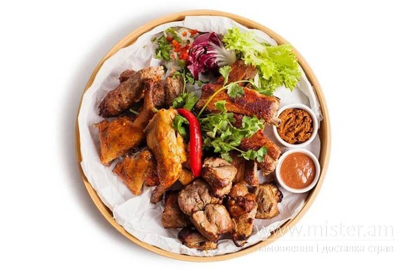 Запечені свинні ребра, люля-кебаб з міксу баранини та телятини, шашлик зі свинини, курча Тапака доповнені соусом ткемалі та аджикою.