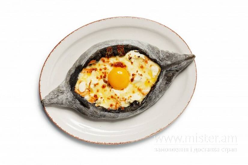 Чорний хачапурі з чорнила каракатиці, поєднаний грузинським сиром, крем-сиром та лососем.