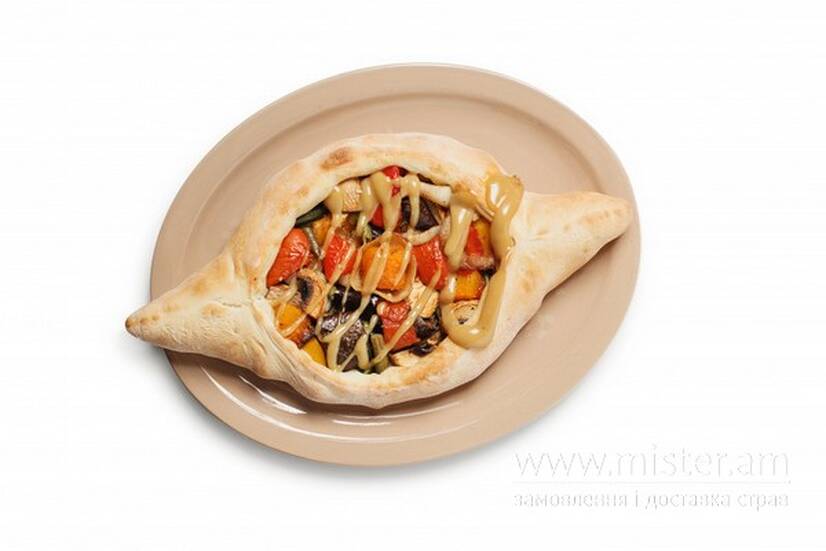 Пісний хачапурі з овочами гриль (болгарський перець, шпарагівка,печериці, баклажан, гарбуз, цибуля) доповнений соусом гриль.