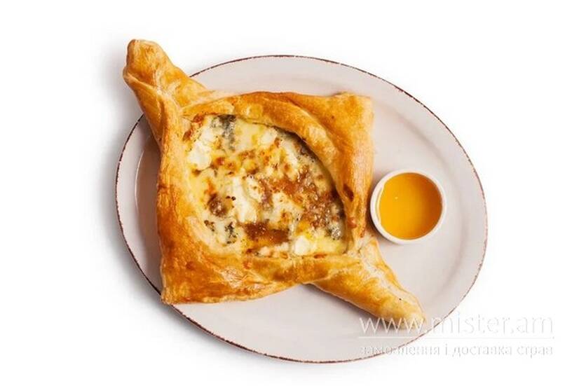 Хачапурі на листковому тісті з сиром сулугуні, крем-сиром та горгондзолою у дуєті з інжирним варенням.