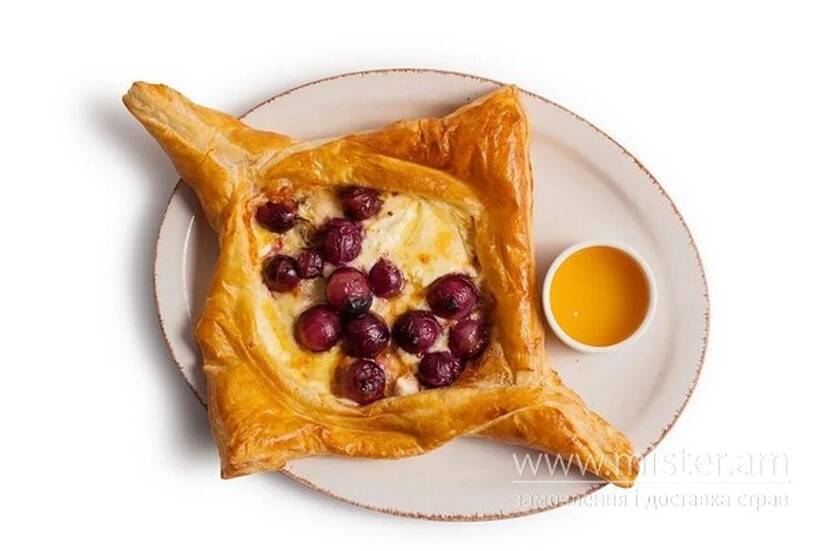 Хачапурі на листковому тісті з сиром сулугуні, крем-сиром, брі, виноградом та медом.