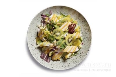 Салат з курячим філе, ківі, міксом салатів та гірчично-медовим соусом.