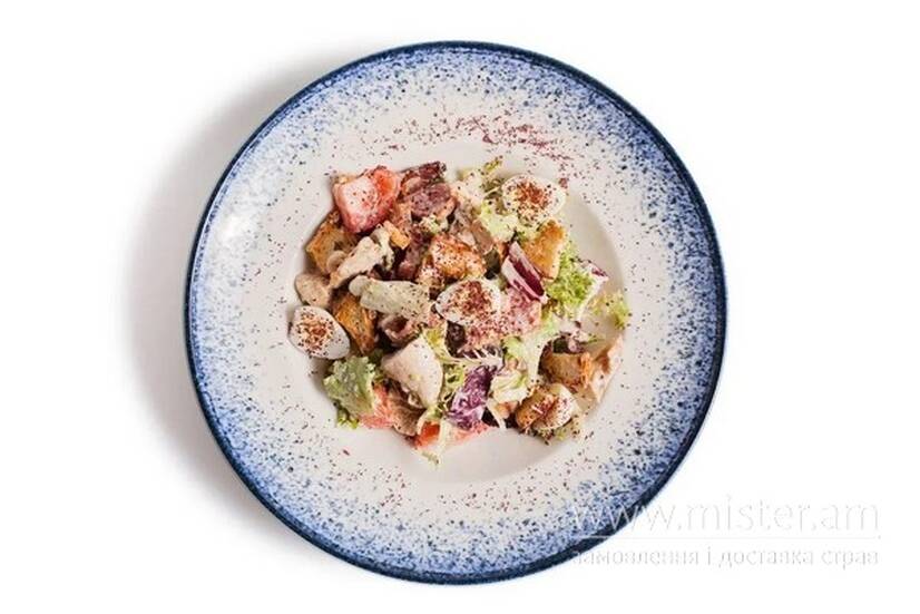 Поєднання курячого філе із томатами, перепелиним яйцем, смаженим бочком, пармезаном на подушці з міксу салату у вершково-пармезановому соусі.