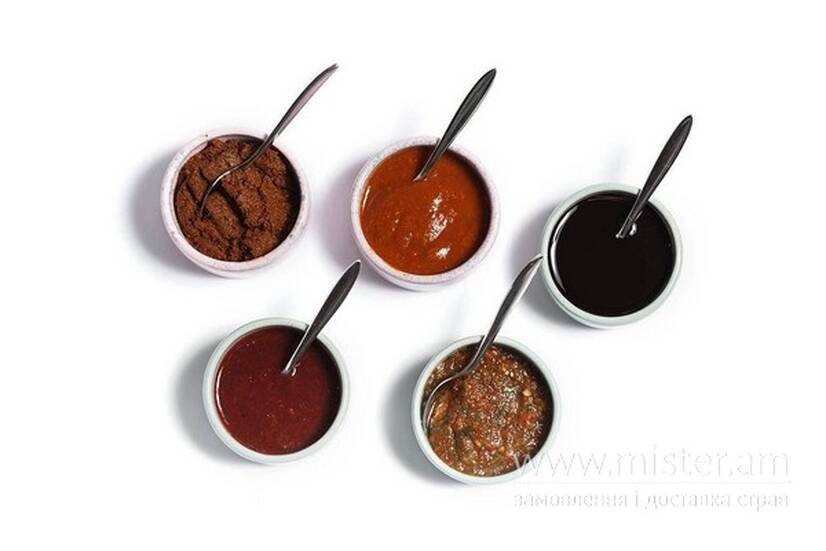 Аджика на основі томатів, болгарського перцю, кореню селери, часнику, перцю чілі та зелені.