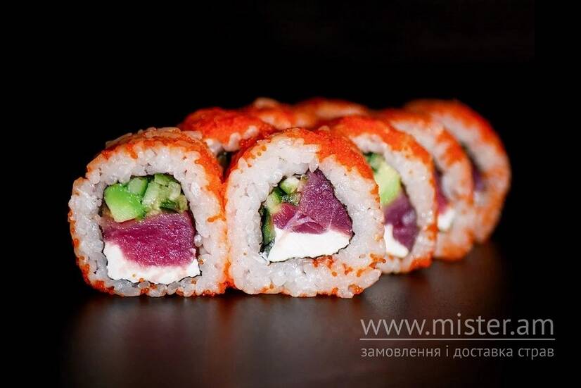 Рис, тунець, авокадо, огірок, крем-сир, норі, ікра масаго.