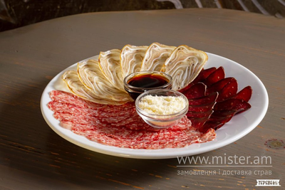 Махан, копчені свинні вушка пресовані, салямі, соєвий соус, пармезан.