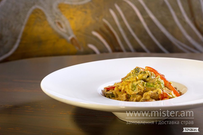 тушковане з овочами на вершках.( броколлі, шпарагівка, печериці, болгарський перець, вершки, соєвий соус )