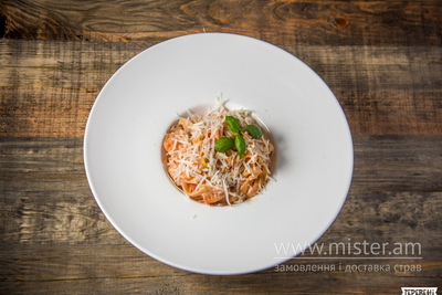 З шматочками апетитного лосося на вершково-томатному соусі з додаванням вина, пармезан.