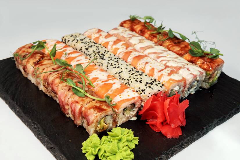 лосось свіжий, лосось обпалений, лосось копчений, тунець свіжий, філадельфія в кунжуті, тунець обпалений