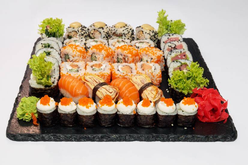 Каліфорнія лосось печений в ікрі, каліфорнія курча теріякі в кунжуті, макі ікра, футо макі тунець, футо макі краб, нігірі омлет 2 шт, нігірі лосось 2 шт.