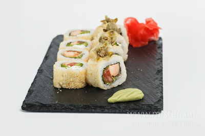 Рис, водорості норі, сир, помідор, лосось печений, кунжут, соус Цезар + теріякі, листя салату, каперси.