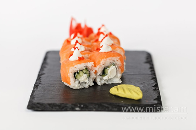 Рис, сир, огірок свіжий, водорості норі, філе лосося, ікра тобіко.