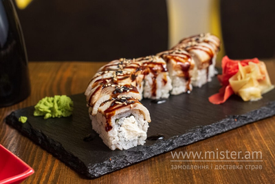 Рис, водорості норі, сир, вугор. Поливається соусом унагі.