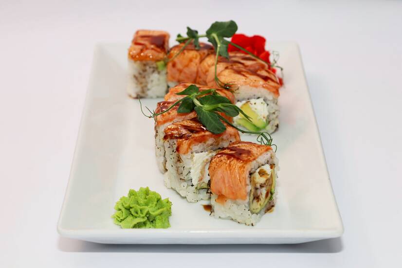 рис, норі, крем-сир, авокадо, соус Унагі, лосось