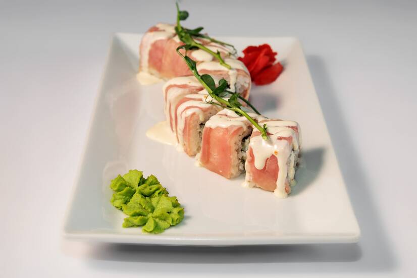 рис, норі, крем-сир, огірок, соус вершковий з ікрою, тунець