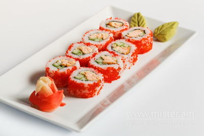 Рис, сир, огірок свіжий, водорості норі, лосось печений, ікра тобіко.