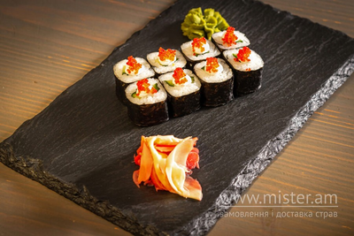 Рис, водорості норі, огірок свіжий, ікра, сир, омлет.
