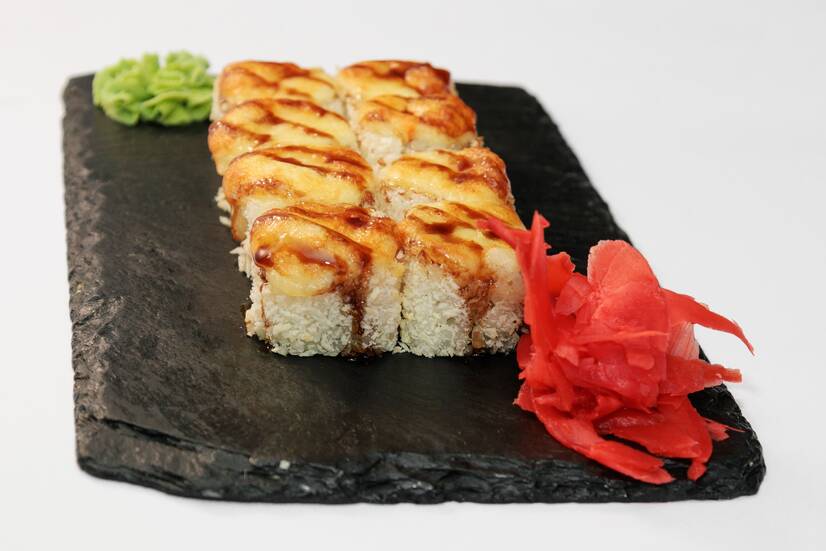 рис, норі, крем-сир, авокадо, сирна шапка, лосось