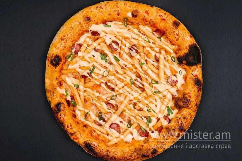 Томатна основа, моцарела, мисливські ковбаски, картопля фрі, сирний соус, зелена цибуля + соус часниковий.